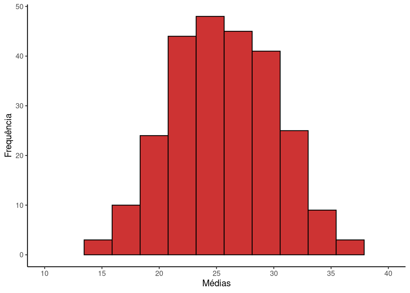 Podemos avaliar graficamente a distribuição das médias amostrais através de um histograma. A grande maioria das médias amostrais concentra-se na porção intermediária do gráfico entre estes limites. Por exemplo, somente 3.2% das observações estão acima de 33.8. Da mesma forma, somente 3.2% das observações estão abaixo de 17.4