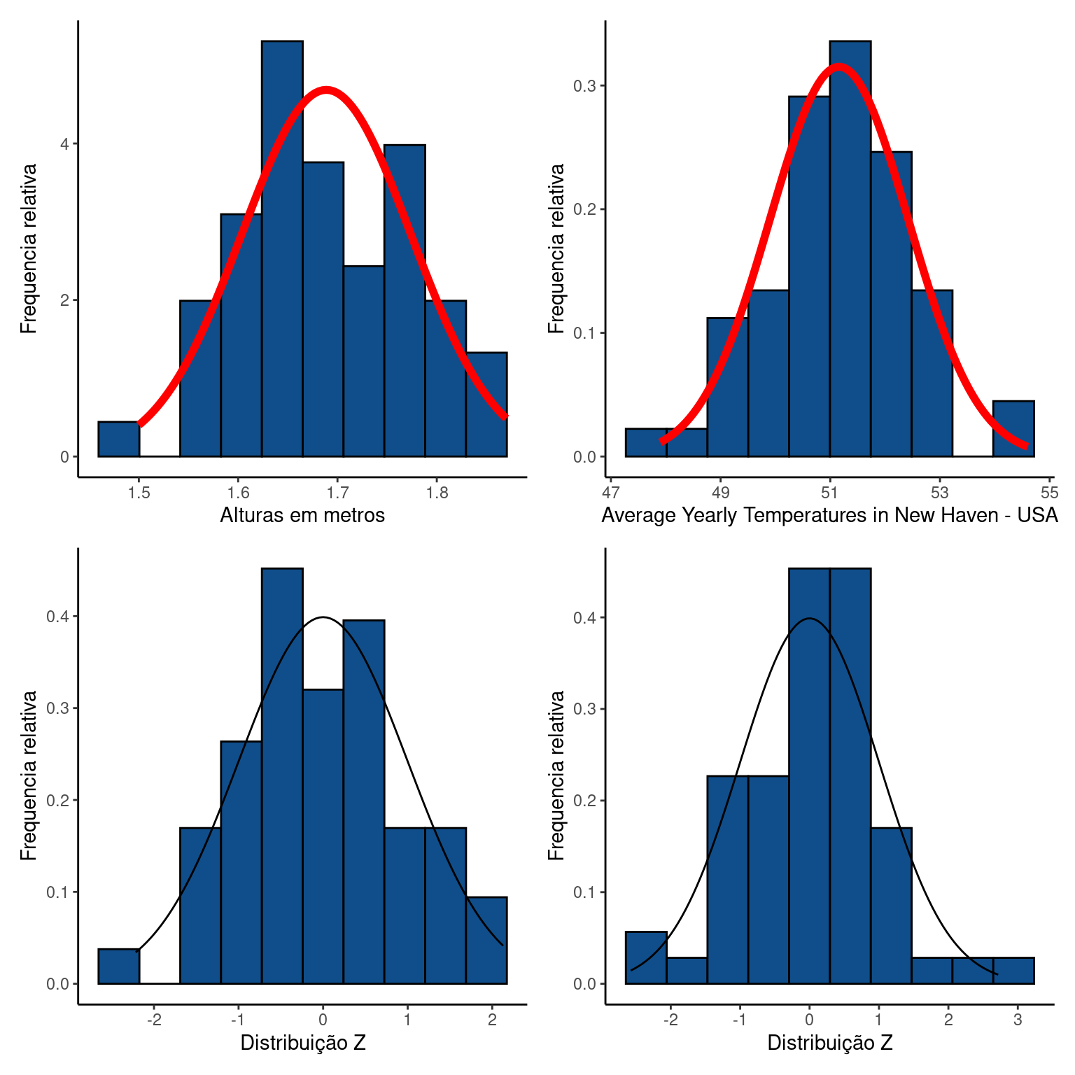 Após a transformação \(Z\) nos exemplos sobre altura dos alunos e da temperatura mensal temos: