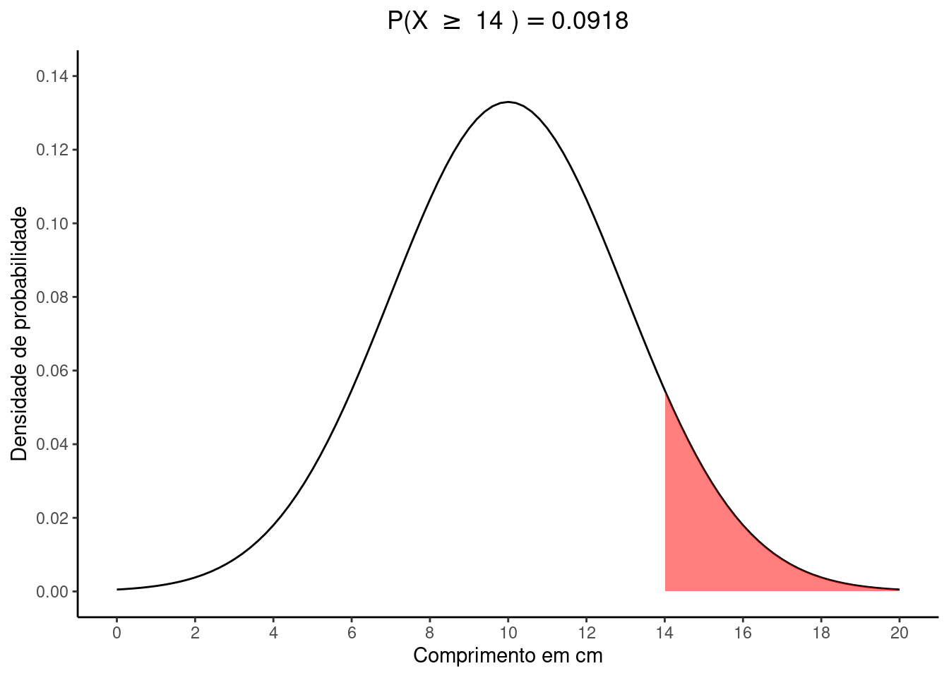 - A probabilidade de capturar um indivíduo maior de 14 cm de comprimento, \(P(X \ge 14)\).