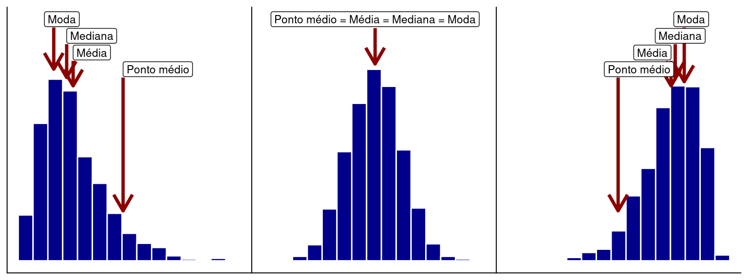 Cada um dos descritores de tendência central descritos acima é mais ou menos sensível ao grau de assimetria de uma distribuição. Em uma distribuição perfeitamente simétrica, onde as observações estão igualmente dispersas acima e abaixo do ponto central, os valores da média, mediana, moda e ponto médio coincidem. Por outro lado, pode ocorrer da distribuição ser assimétrica. Neste caso, a posição relativa dos descritores irá depender se a assimetria é à direita ou à esquerda. Esta discrepância ocorre devido à sensibilidade destes descritores a valores extremos na distribuição. O ponto médio é o mais sensível à presença de pontos extremos, seguido da média, mediana e moda.
