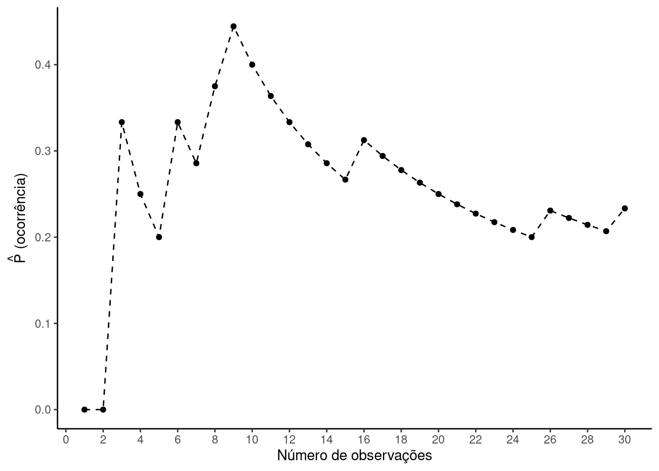 Note como a estimativa de \(P(ocorre)\) oscila. Espera-se que este valor gradualmente aproxime-se para probabilidade real à medida que o número de observações cresce.