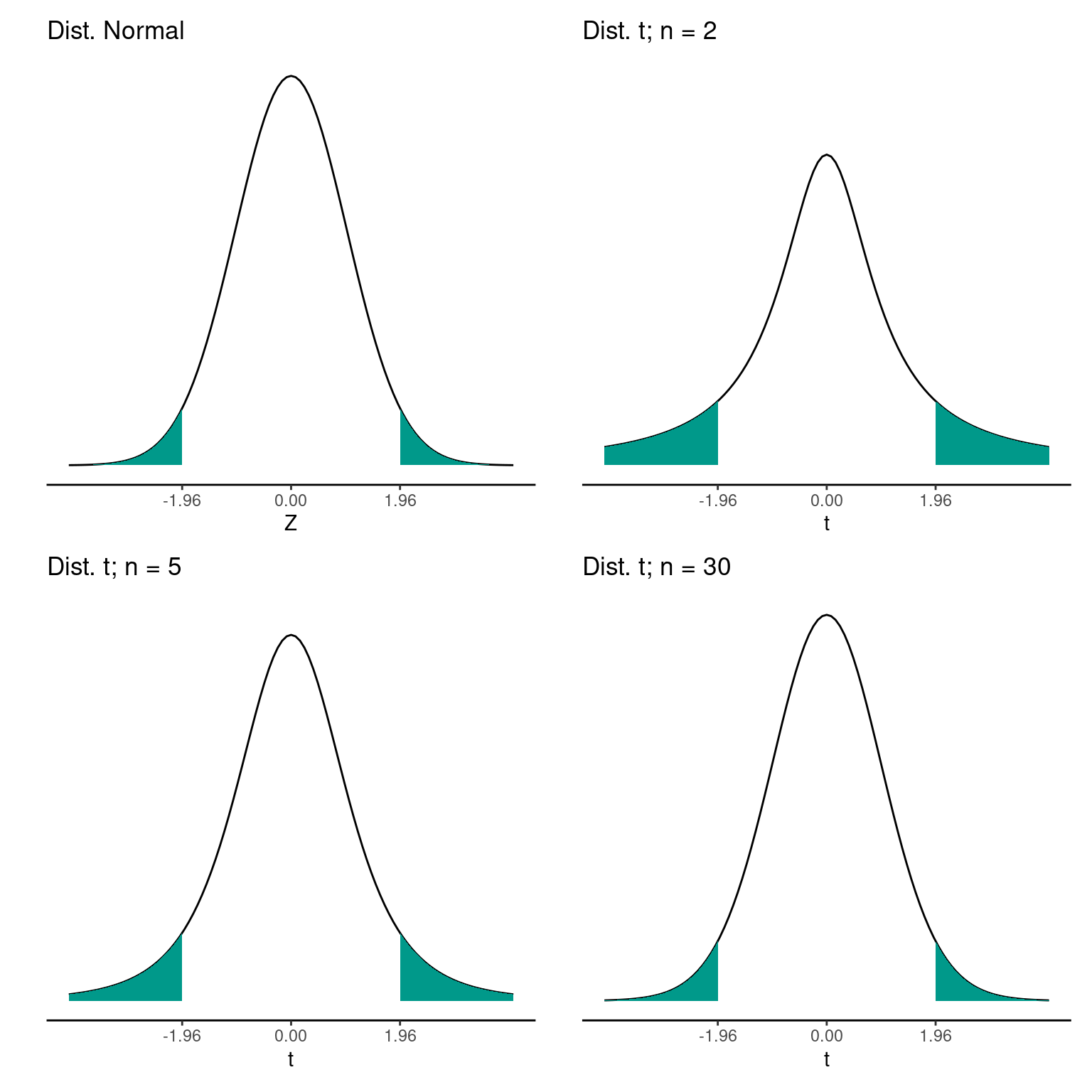 Para amostras pequenas (\(n = 2\)) o formato da distribuição de \(t\) é distinto da distribuição normal. No entanto, para tamanhos amostrais maiores (\(n = 30\)) as o formato da distribuição \(t\) tende a a convergir para o mesmo formato a distribuição normal. Esta característica implica que a área a partir de um determinado limite \(t_i\) não é constante como na distribuição normal, mas depende do tamanho da amostra, como pode ser visto abaixo.