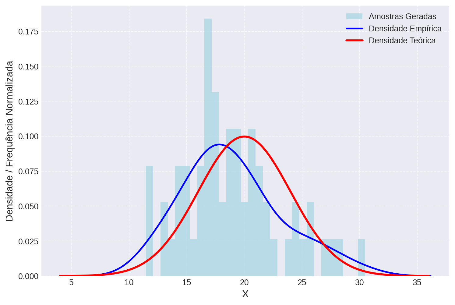- Aumente e diminua o tamanho da amostras e verifique a variação entre as curvas enpíricas e a curva teórica.