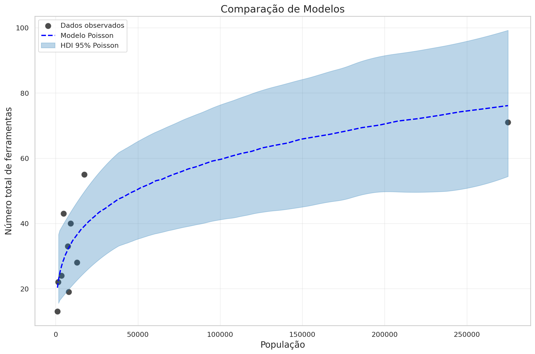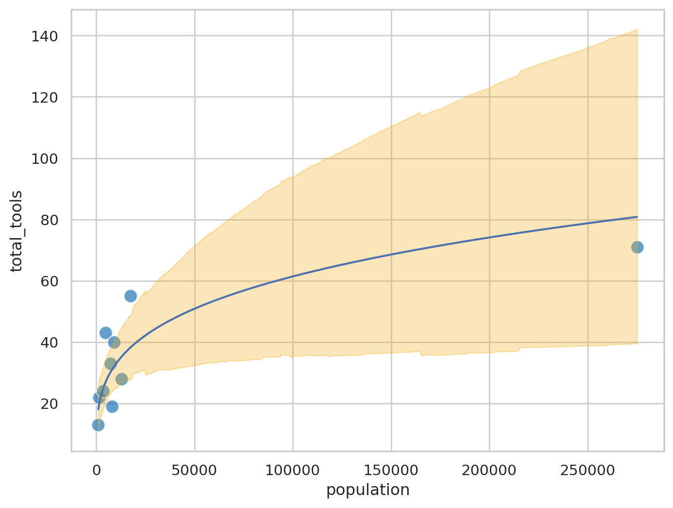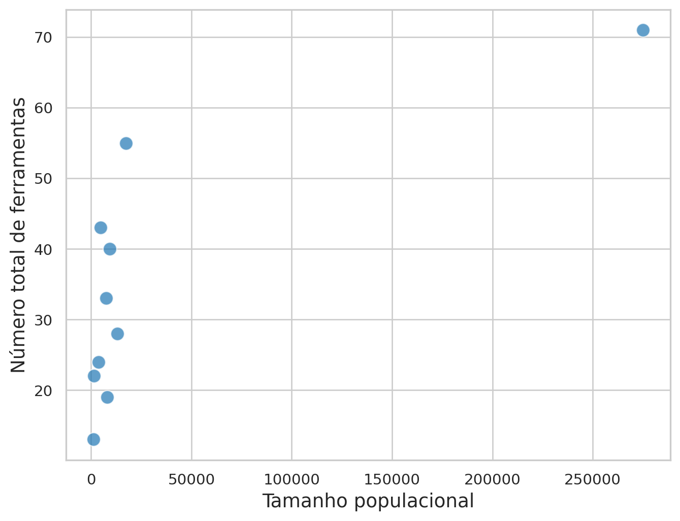 Vamos utilizar modelos estatísticos para analisar a complexidade tecnológica tradicional em ilhas da Oceania (Kline e Boyd 2010). Nosso objetivo é compreender como o tamanho populacional influenciou o número de ferramentas disponíveis em cada sociedade.