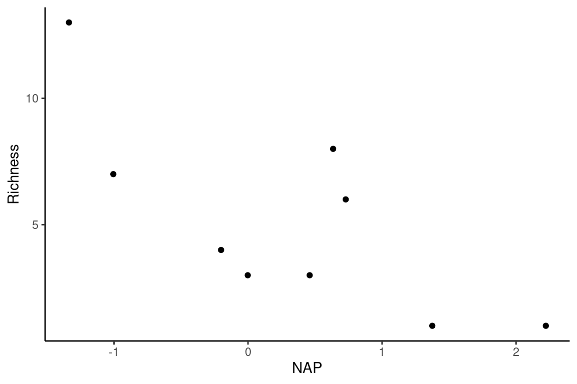 (\(df) df[seq(3,43,by = 5),])()Considere a tabela abaixo com os dados de riqueza da macro-fauna praial (número de espécies) e de um índice de exposição às ondas (NAP). Os dados foram obtidos em 2002 na costa da Holanda em nove praias (Zuur et al. 2009). Valores negativos de NAP se referem a locais mais expostos e valores positivos a locais menos expostos à ação das ondas.
