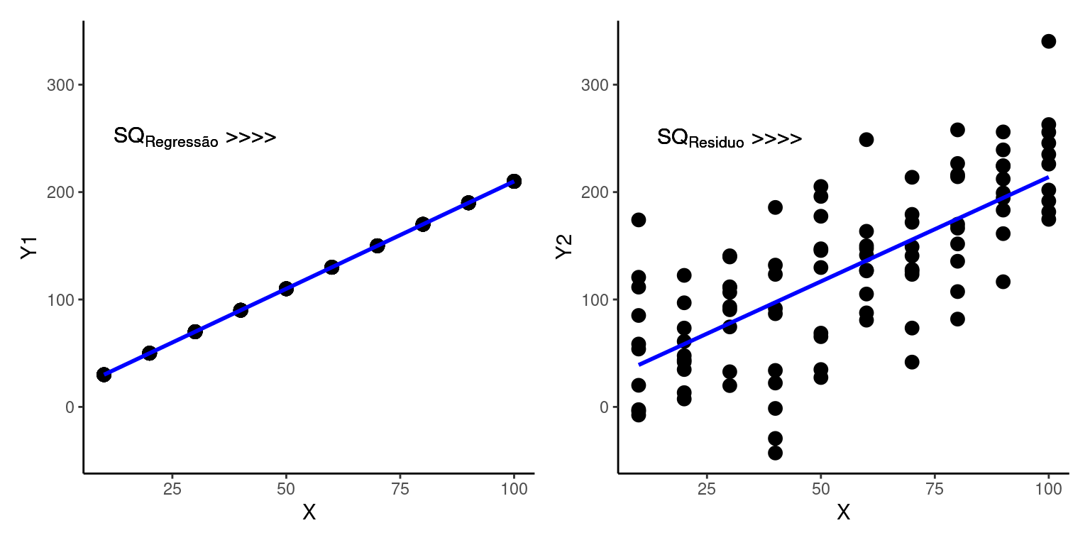Nas figuras acima, a linha da esquerda (\(SQ_{Resíduo} = \sum{\epsilon_i^2} = 37\)) está claramente melhor ajustada à nuvem de pontos, o que se expressa em um menor somatório dos quadrados dos resíduos (\(SQ_{Resíduo} = \sum{\epsilon_i^2} = 37\)) quando comparado com o ajuste da figura à direita (\(SQ_{Resíduo} = \sum{\epsilon_i^2} = 145\)).