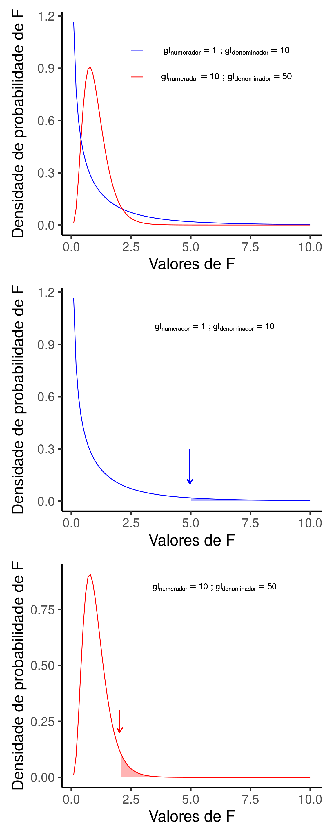 O valor de \(F\) na tabela se refere a distribuição de probabilidade F. Esta distribuição de probabilidades é esperada para a razão entre duas variâncias amostrais. No caso da regressão linear, estas são a variância da regressão (\(QM_{Regressão}\) no numerador) e a variância residual (\(QM_{Resíduo}\) no denominador). Diferente da distribuiçao t, a distribuição F tem um formato assimétrico, sendo que o grau de assimetria depende dos graus de liberdade do numerador e do denominador. O valor de \(p\) na tabela se refere à área sob a distribuição F, acima do valor de \(F\) calculado. Na ANOVA da regressão, um valor de \(p < \alpha\) nos leva a rejeitar a hipótese nula e assumir que a variável \(X\) exerce algum efeito sobre \(Y\).