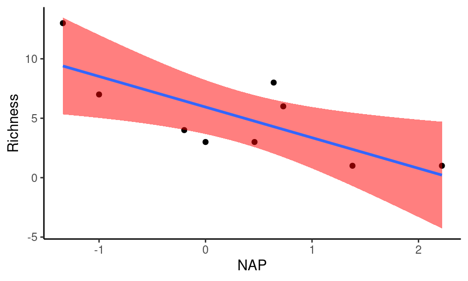 Note que na figura acima, estão representados os valores observados de riqueza de espécies (em preto), os valores ajustados (azul) e os intervalos a 95% (vermelho). Os valores ajustados são aqueles utilizados para construir a reta de regressão. O intervalo não costuma ser representados por pontos individuais, mas por uma banda que delimita a área que restringe o intervalo de confiança ao nível \(1 - \alpha\) como na figura abaixo.