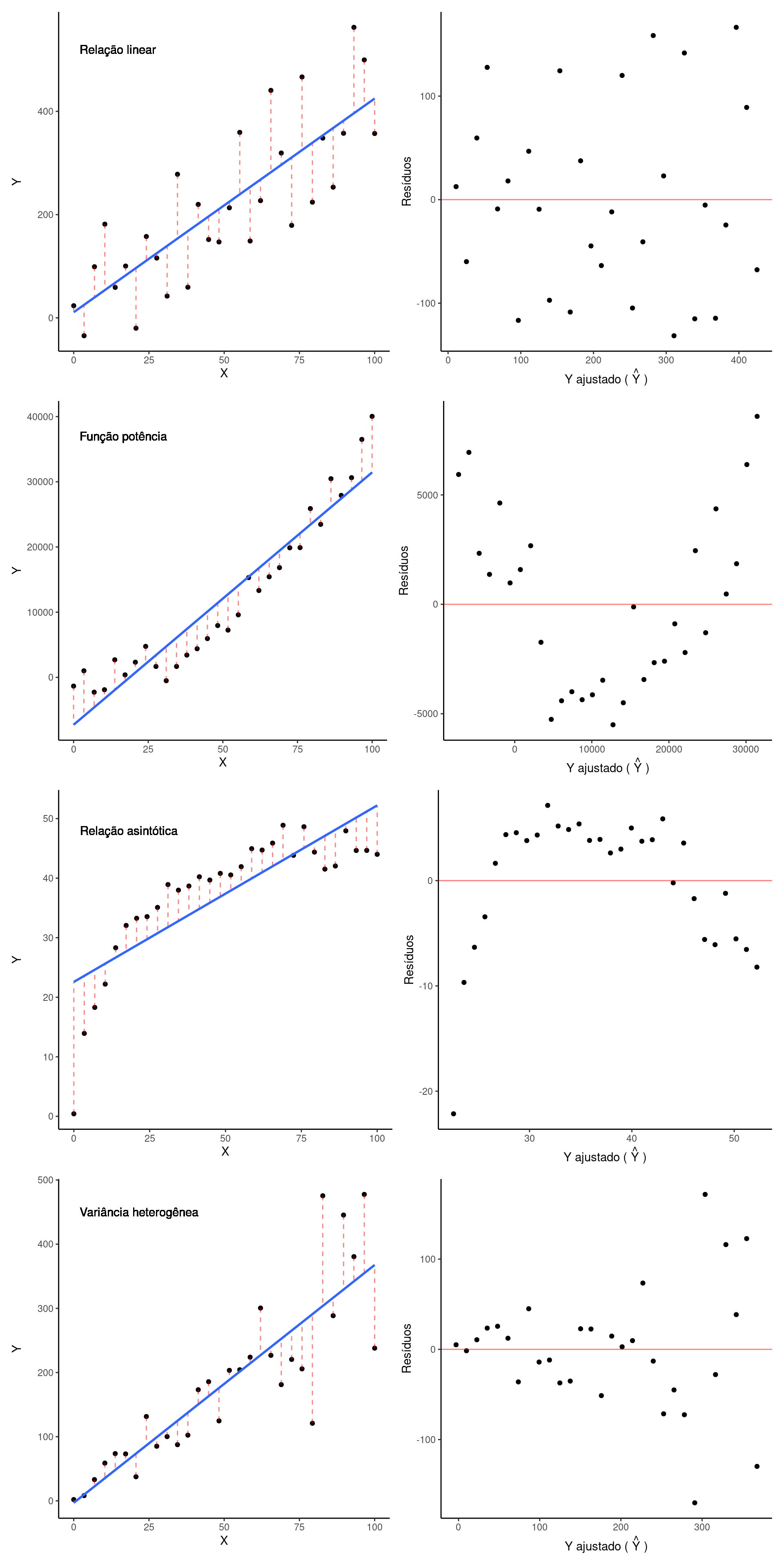 O primeiro diagnóstico da regressão é conhecido como gráfico de resíduos, que consiste em um gráfico de dispersão entre os resíduos e o valor ajustado \(\hat{Y}\). Abaixo estão os gráficos de resíduos que surge quando ajustamos uma reta a dados que apresentam uma relação linear, uma função potência, uma função assintótica e uma relação linear porém comm variância heterogênea.