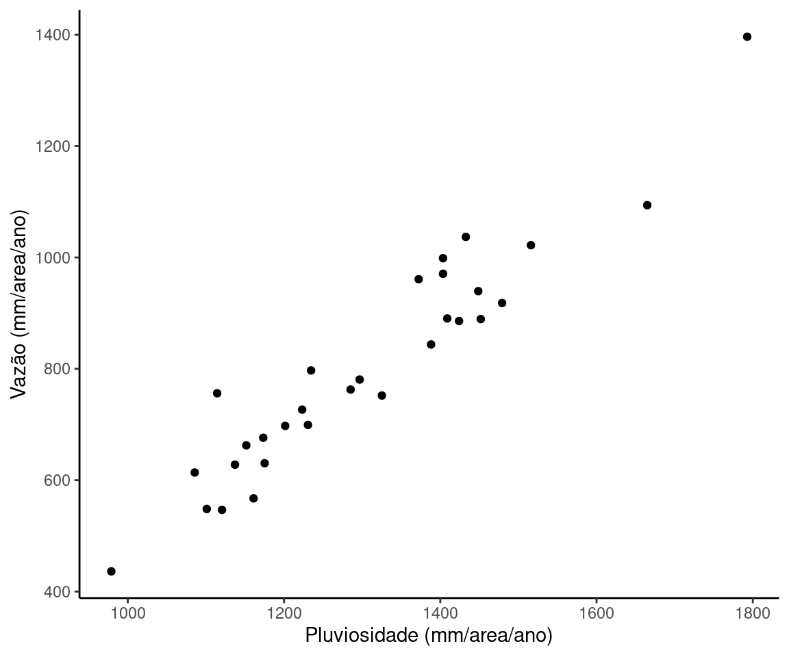(\(df) df[-31, ])()Considere novamente os dados sobre pluviosidade anual e vazão em uma bacia hidrográfica americada, medidos entre os anos de 1958 e 1987 (disponível em: tiee.esa.org). Vamos avaliar a relação entre a vazão na bacia e os volumes de chuva.