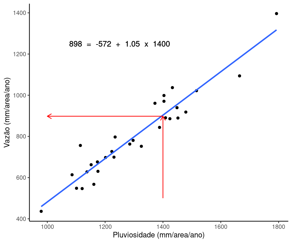 Esta linha nos permite obter uma estimativa sobre a vazão esperada (\(Y\)) para qualquer dado volume de chuva (\(X\)). Neste exemplo, a equação que melhor associa vazão e chuva é: