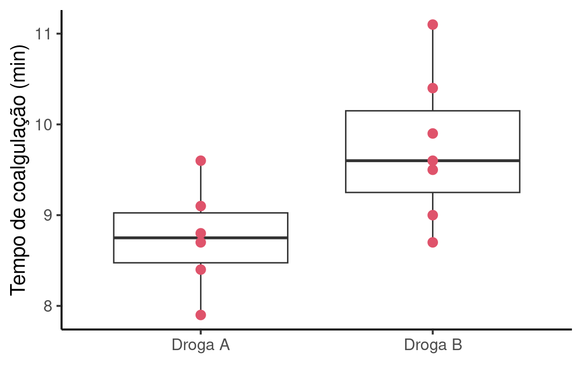 Uma vez que a probabilidade associada ao valor de \(t\) é menor que o nível de significância, rejeitamos \(H_0\) e assumimos que os tempos médios de coagulação são diferentes. Ao avaliar as média amostrais \(\overline{X}_A\) e \(\overline{X}_B\), concluímos que a droga \(A\) resulta, em média, em tempos menores de coagulação.