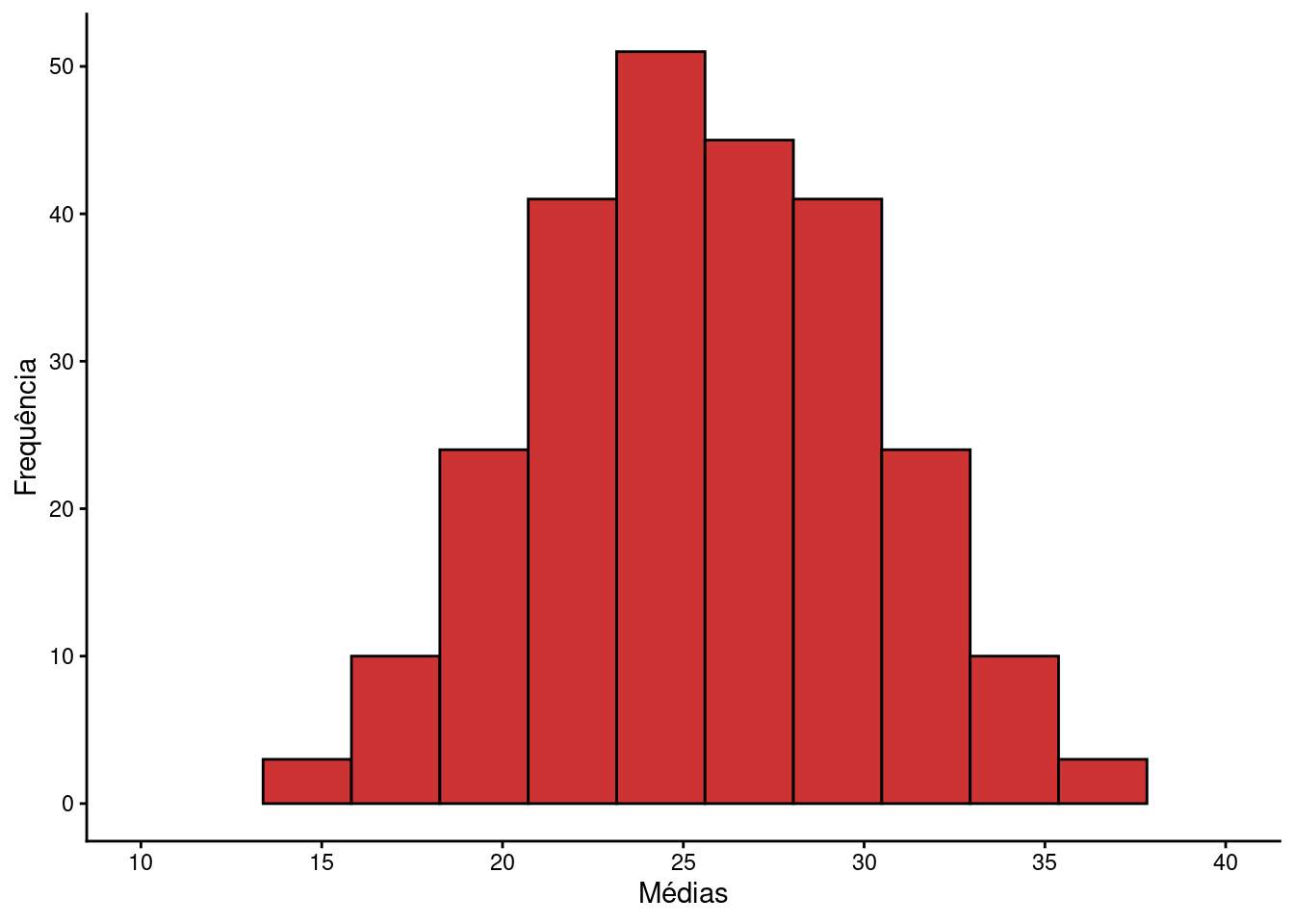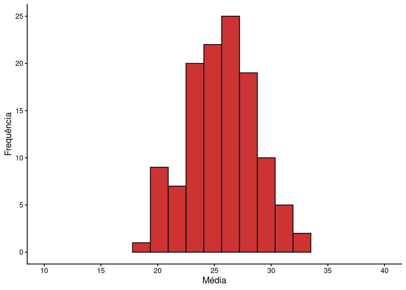 Podemos avaliar graficamente a distribuição das médias amostrais através de um histograma. A grande maioria das médias amostrais concentra-se na porção intermediária do gráfico entre estes limites. Por exemplo, somente 3.2% das observações estão acima de 33.8. Da mesma forma, somente 3.2% das observações estão abaixo de 17.4