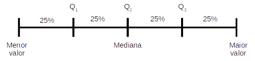 Os quartis podem ser indicados por \(Q_1\), \(Q_2\) e \(Q_3\), conforme a figura abaixo.