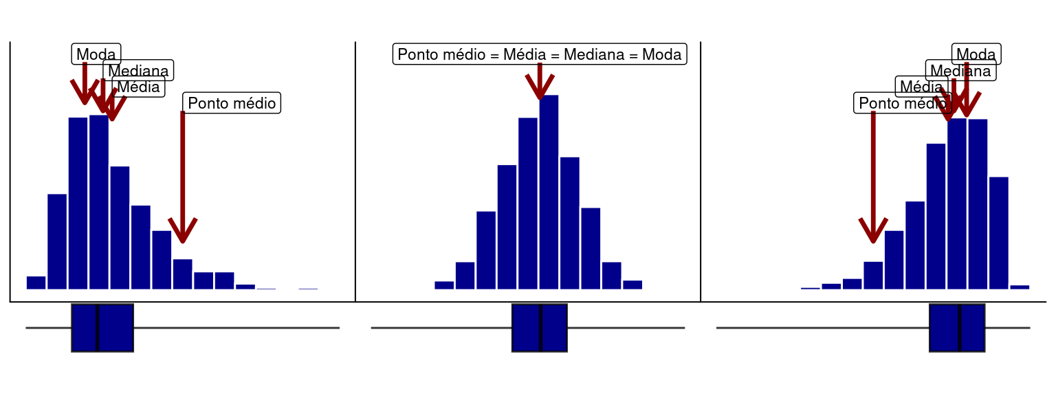 Existe uma relação entre os histogramas e os boxplots. Ambos podem ser utilizados para avaliar o grau de assimetria de uma distribuição, como apresentado abaixo. Em uma distribuição simétrica, a caixa do boxplot tende a se concentrar no meio da distribuição. Já em distribuições assimétricas, a caixa tende a ficar deslocada à esquerda ou à direita (Figura 3).