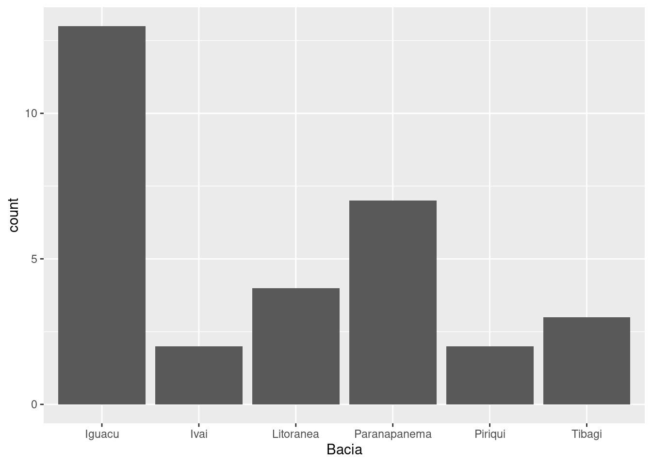 ggplot(res): define a tabela de dados que será utilizada.aes(x = Bacia): define que o eixo x deste gráfico deverá conter os níveis da variávelBacia.geom_bar(): define o tipo gráfico, que noggplot2é denominado de geometria gráfica.