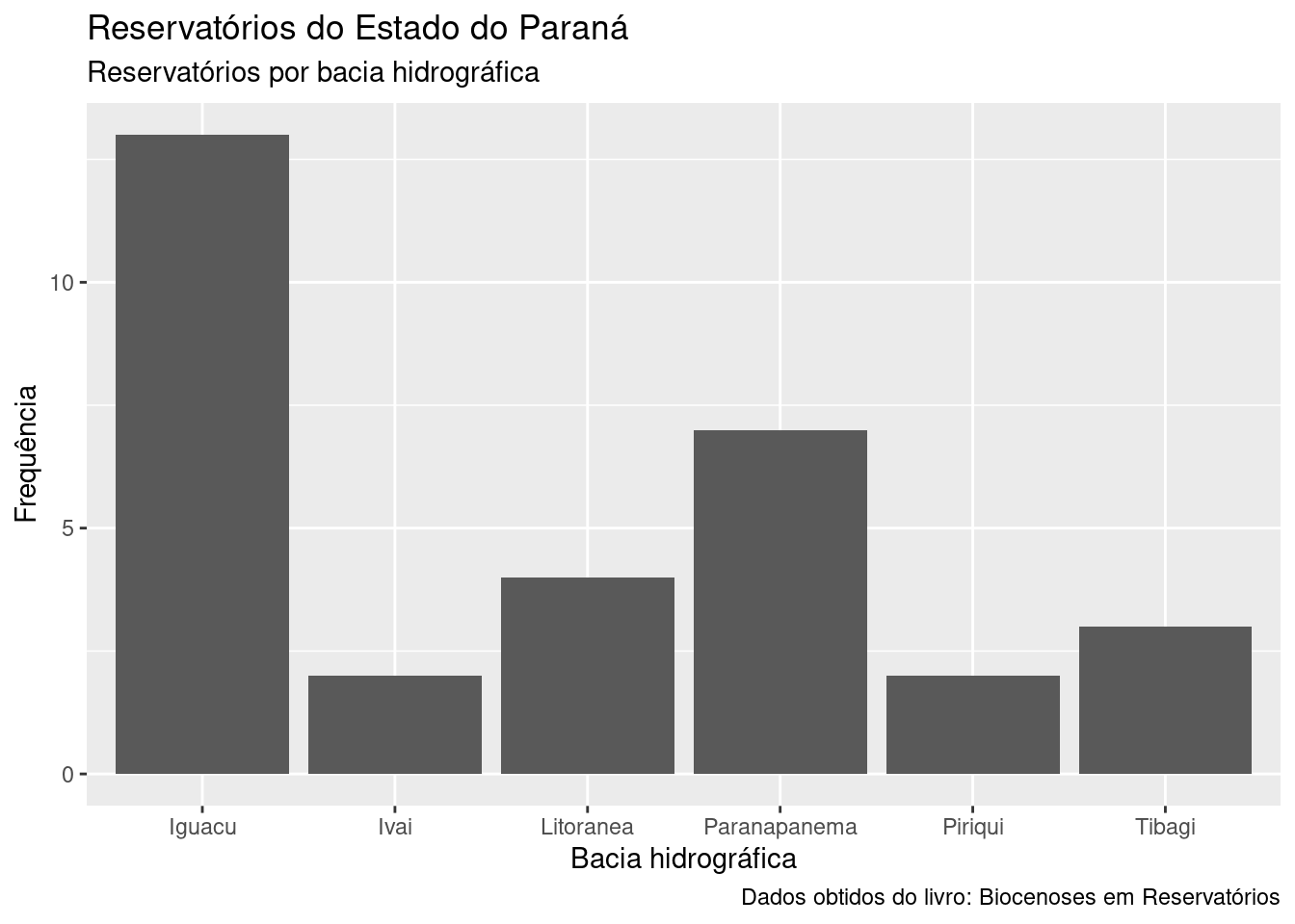 O resultado mostra que existem 13 reservatórios na tabela pertencentes à bacia do rio Iguacu, 2 à bacia do rio Ivai e assim por diante. Confira estas contagens na base de dados.