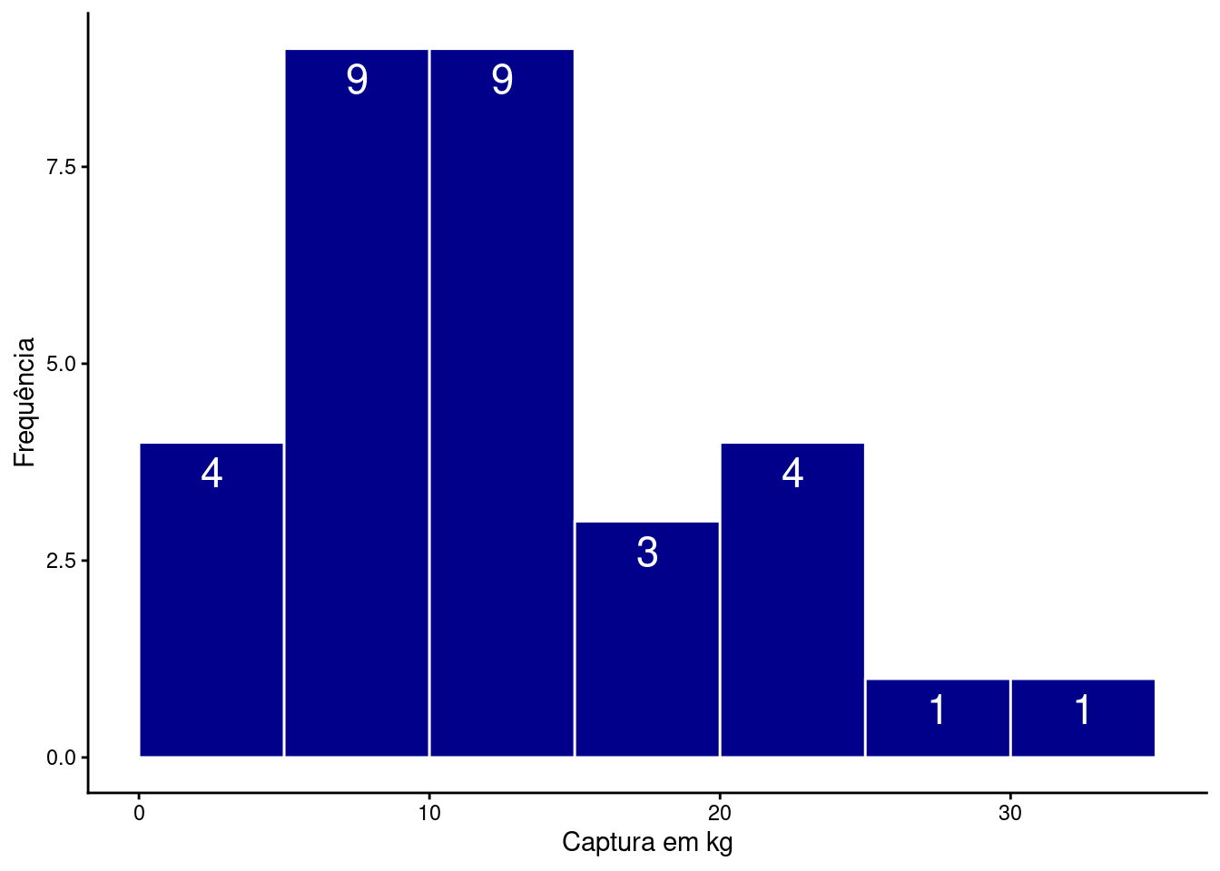 Vemos que o menor valor é 2.05 \(kg\) e o maior 30.76 \(kg\). Assumindo que temos 31 observações, vamos criar um intervalo de classes de 5 em 5 unidades. Para isso, criaremos a variável cl_cpue, que será uma sequência de \(0\) a \(35\), com tamanho \(5\). Os valores nesta sequência são os limites de classe.