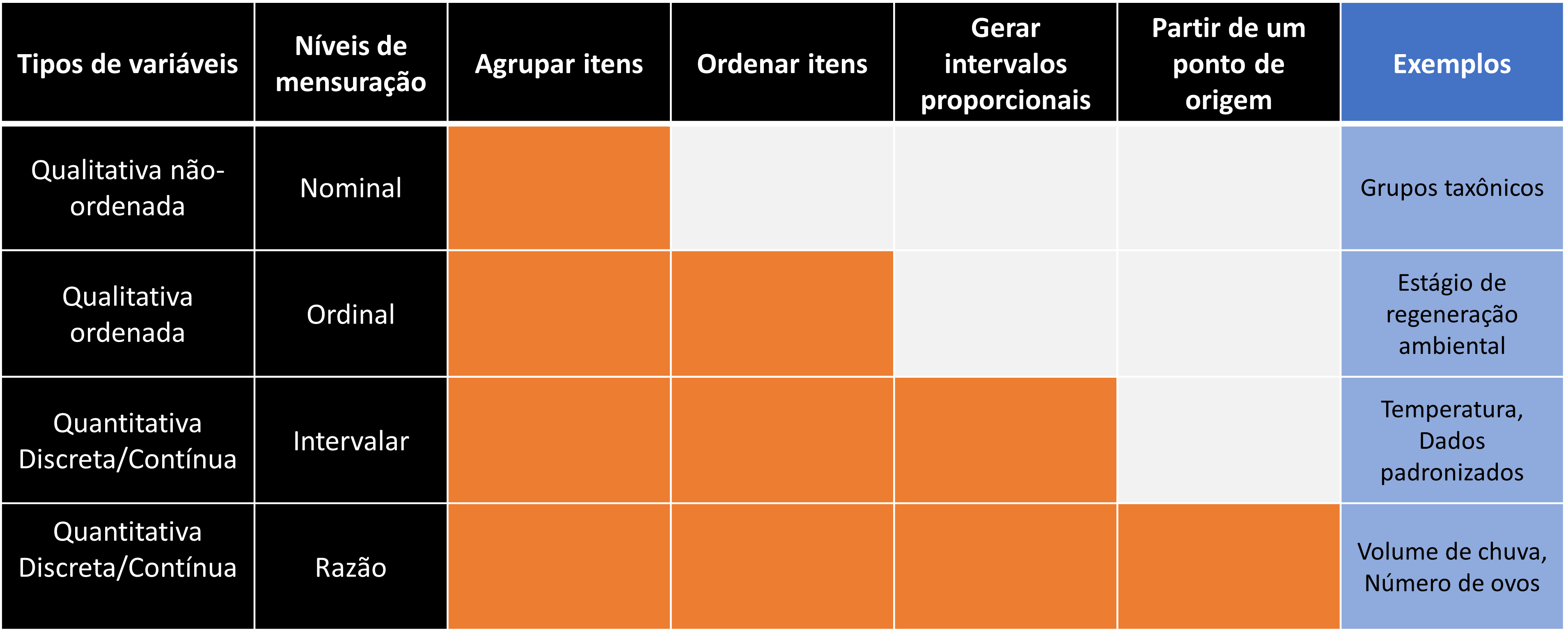 Nível nominal: é característico de variáveis que possuem níveis não ordenaveis. Ex. cor, grupo taxonômico, nomes de cidades, etc.