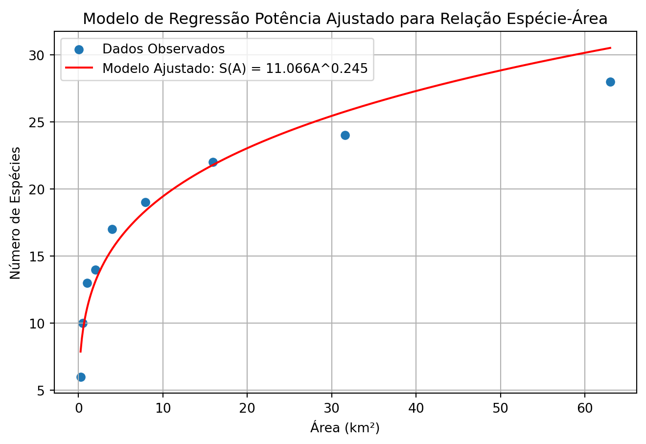 print(f"Riqueza predita para uma área de 70 km²: {S_70km2[0]:.3f} ≈ {round(S_70km2[0])} espécies")Riqueza estimada para uma área de 10 km²: 19.443 ≈ 19 espécies