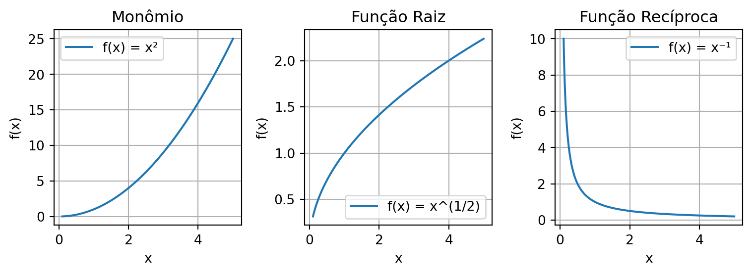 - Função raiz: para \(k = 1/n\), onde \(n\) é um inteiro positivo. Exemplos - \(f(x) = x^{1/2}\) (raiz quadrada) ou \(f(x) = x^{1/3}\) (raiz cúbica).