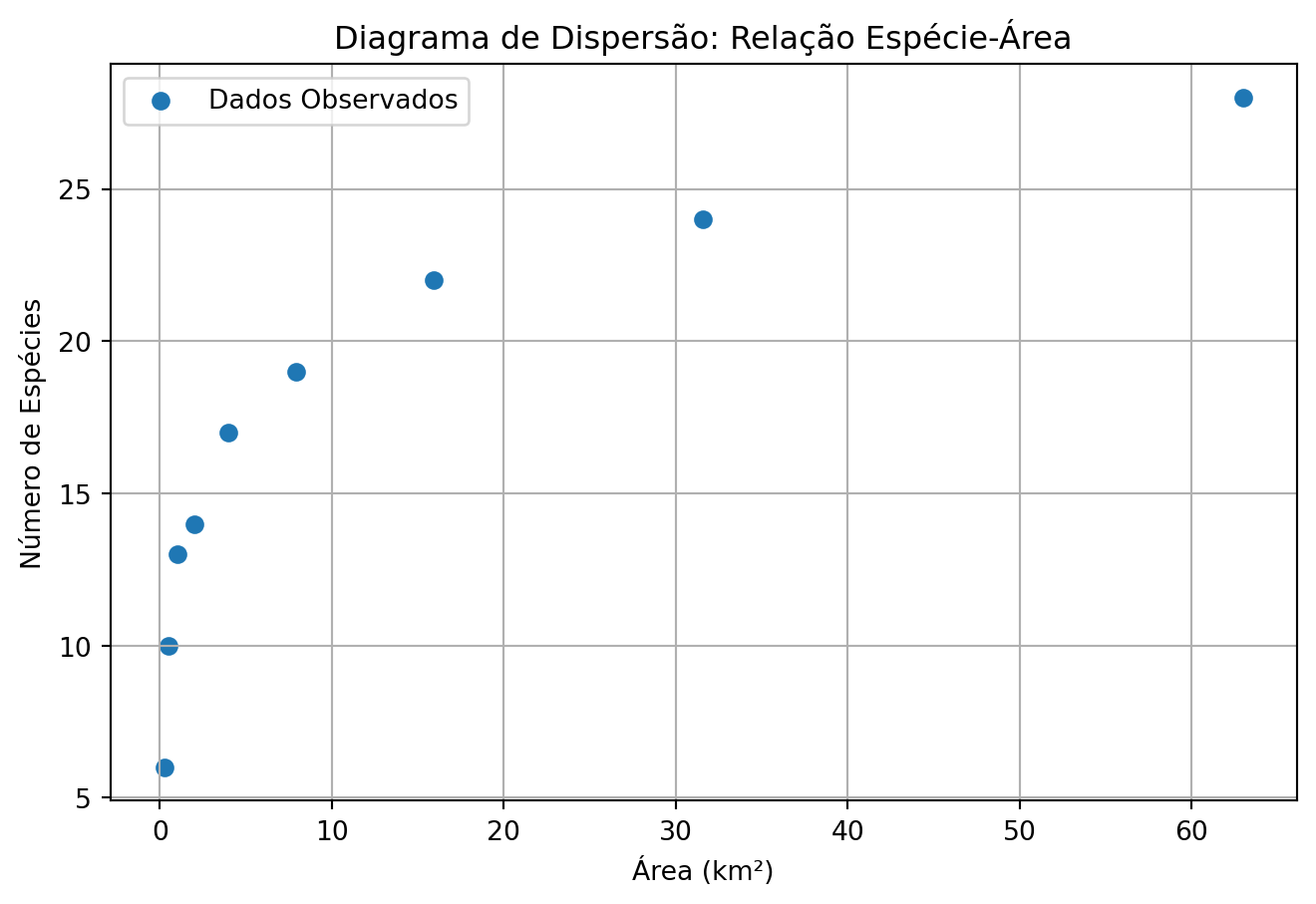 plt.title('Diagrama de Dispersão: Relação Espécie-Área')