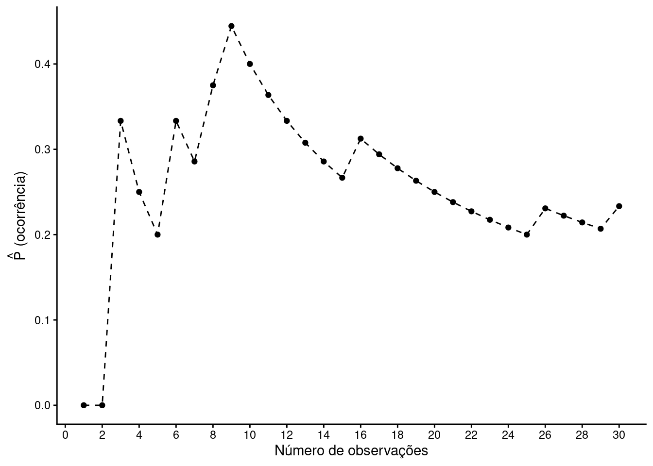 Note como a estimativa de \(P(ocorre)\) oscila. Espera-se que este valor gradualmente aproxime-se para probabilidade real à medida que o número de observações cresce.