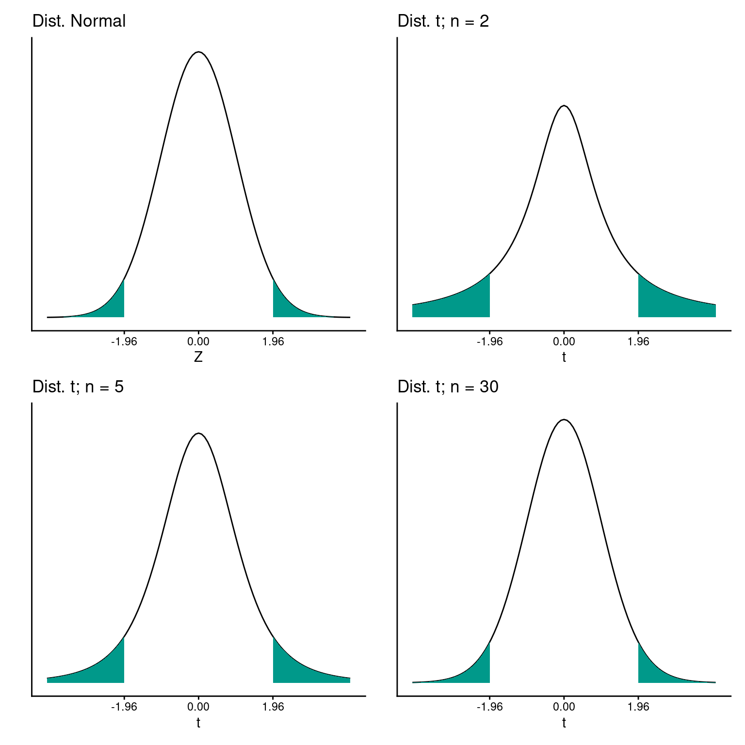 Para amostras pequenas (\(n = 2\)) o formato da distribuição de \(t\) é distinto da distribuição normal. No entanto, para tamanhos amostrais maiores (\(n = 30\)) as o formato da distribuição \(t\) tende a a convergir para o mesmo formato a distribuição normal. Esta característica implica que a área a partir de um determinado limite \(t_i\) não é constante como na distribuição normal, mas depende do tamanho da amostra, como pode ser visto abaixo.