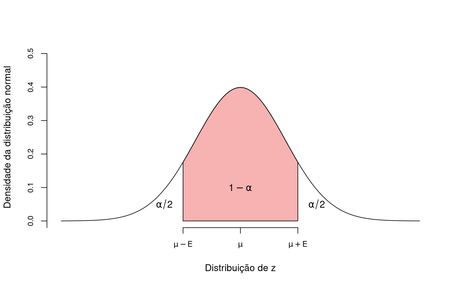 Uma representação esquemática do erro amostral e do nível de confiança na distribuição de \(z\) pode ser vista abaixo: