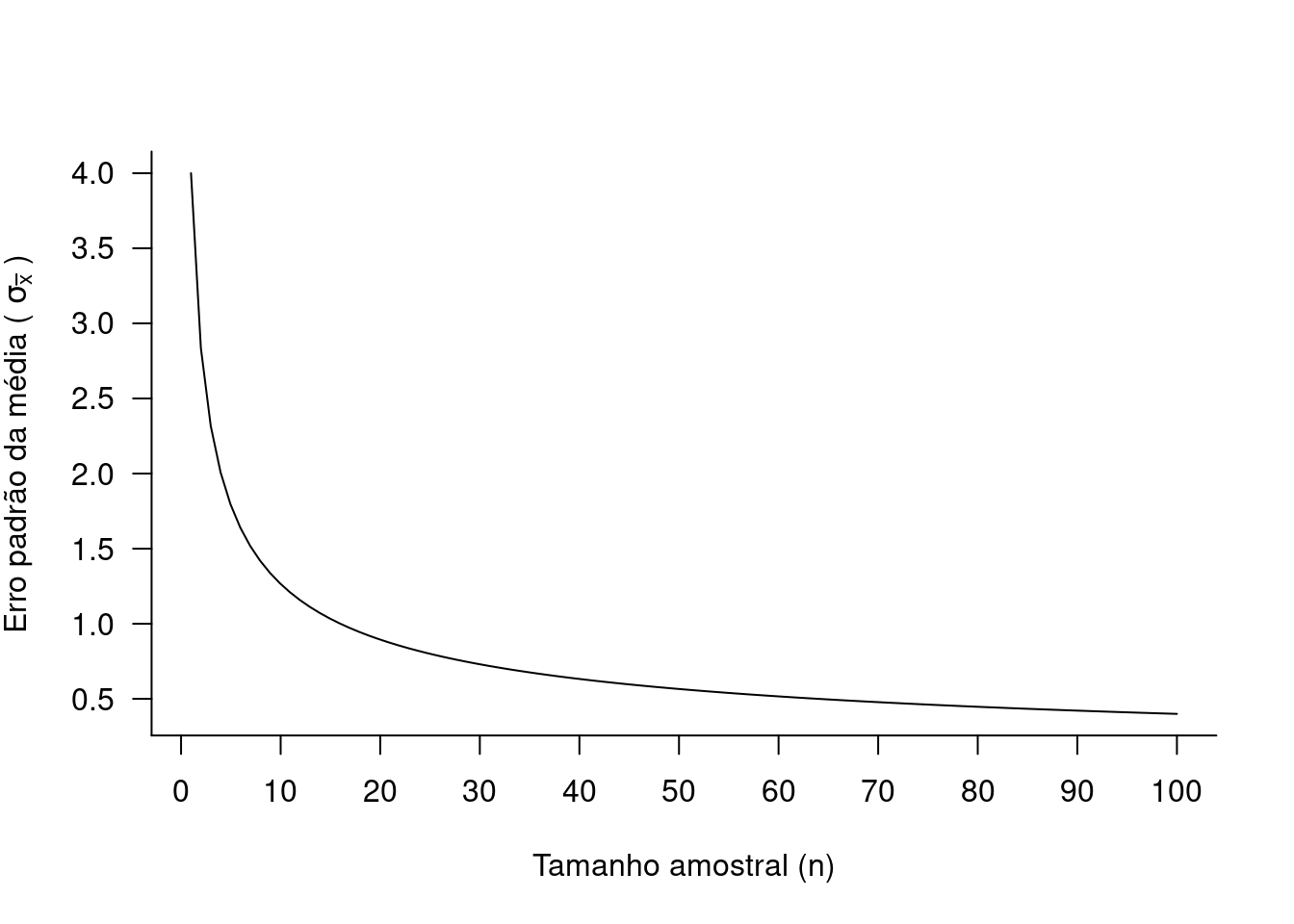 Neste exemplo, para amostras de tamanho 1, \(\sigma_{\overline{X}} = 4\). Se tivermos agora amostras de tamanho 10, \(\sigma_{\overline{X}} = 1.2\), uma redução de mais de 50%. No entanto aumentarmos o tamanho amostral para 50 o erro padrão cai somente de \(1,2\) para \(0,56\). Isto significa que a partir de determinado ponto (neste exemplo a partir de \(10\) ou \(20\) amostras), a redução no erro padrão torna-se mínima. Neste momento podemos podemos refletir sobre o custo de continuar aumentando o tamanho amostral para obter um ganho cada vez menor em precisão.