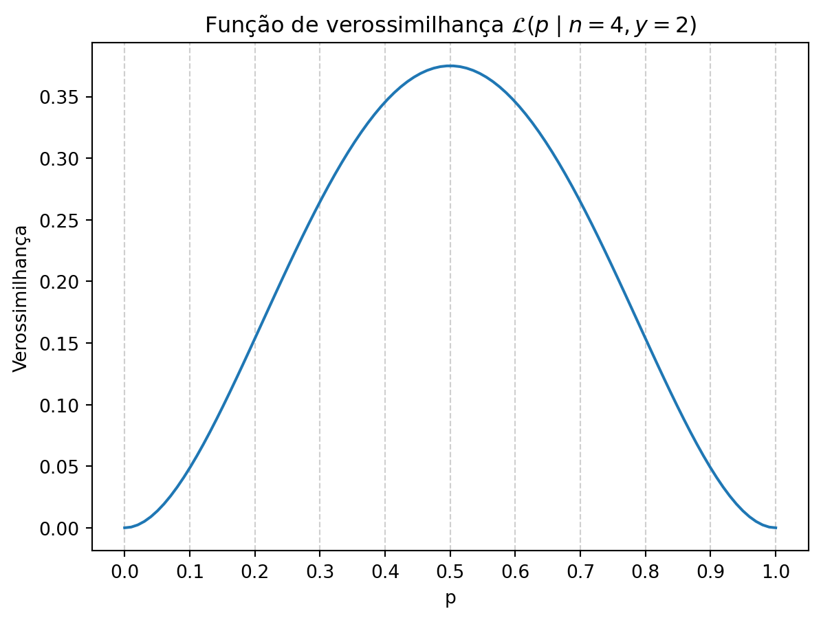 A partir do modelo binomial, podemos definir a função de verossimilhança para um resultado observado. Imagine que, em \(n = 4\) lançamentos, foram observados \(y = 2\) pontos sobre a água. Não sabemos a verdadeira proporção \(p\) de água que cobre a Terra; portanto, fazemos conjecturas e avaliamos cada uma com base nas observações.