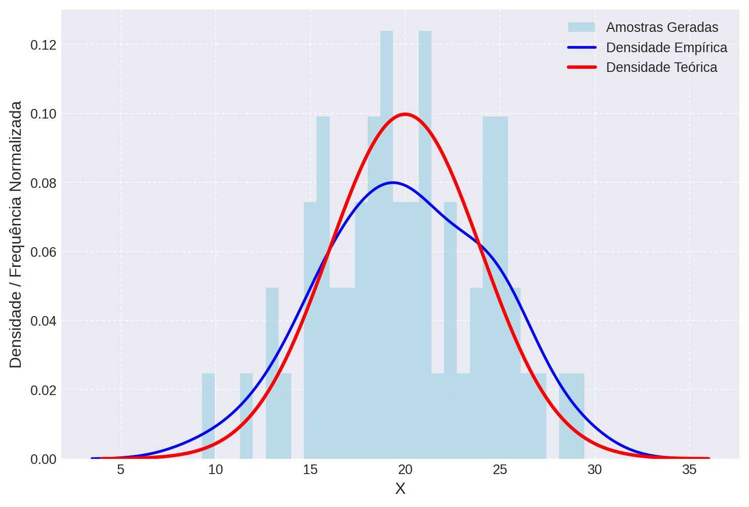 - Aumente e diminua o tamanho da amostras e verifique a variação entre as curvas enpíricas e a curva teórica.