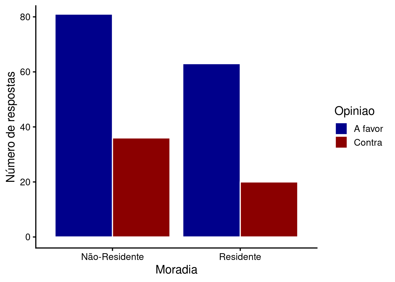 dos \(144\) entrevistados que são A favor, cerca de \(56.25\%\) são Não-Residente, enquanto os demais \(43.75\%\) são Residente