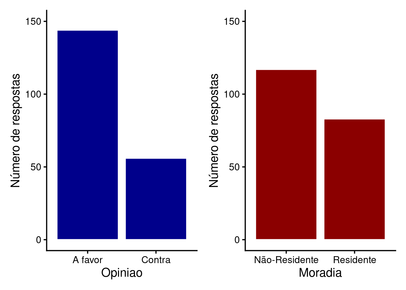 Das \(200\) respostas tivemos \(144\) pessoas A favor (\(72\%\)) e \(56\) pessoas Contra (\(28\%\)).