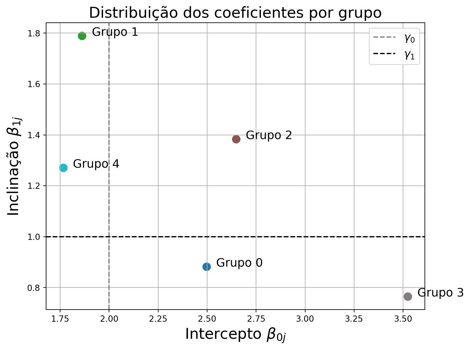 Visualizando a dispersão dos parâmetros em relação às médias populacionais \(\gamma_0, \gamma_1\).