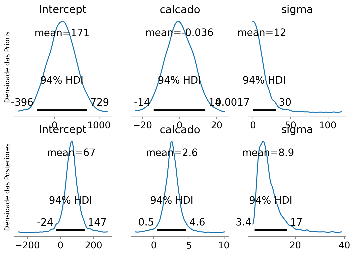A comparação gráfica entre as distribuições a priori e a posteriori dos parâmetros nos ajuda a avaliar o quanto os dados foram informativos, mostrando quais parâmetros foram mais ou menos atualizados em relação às nossas crenças iniciais. Uma pequena mudança da prior para a posteriori indica que os dados trouxeram pouca informação nova sobre aquele parâmetro, enquanto uma grande diferença sugere que os dados foram bastante informativos. No gráfico abaixo, visualizamos essa comparação para os parâmetros do modelo (Intercept, calcado e sigma), onde a linha superior exibe as distribuições a priori (atribuídas automaticamente) e a linha inferior apresenta as distribuições a posteriori resultantes da análise bayesiana.
