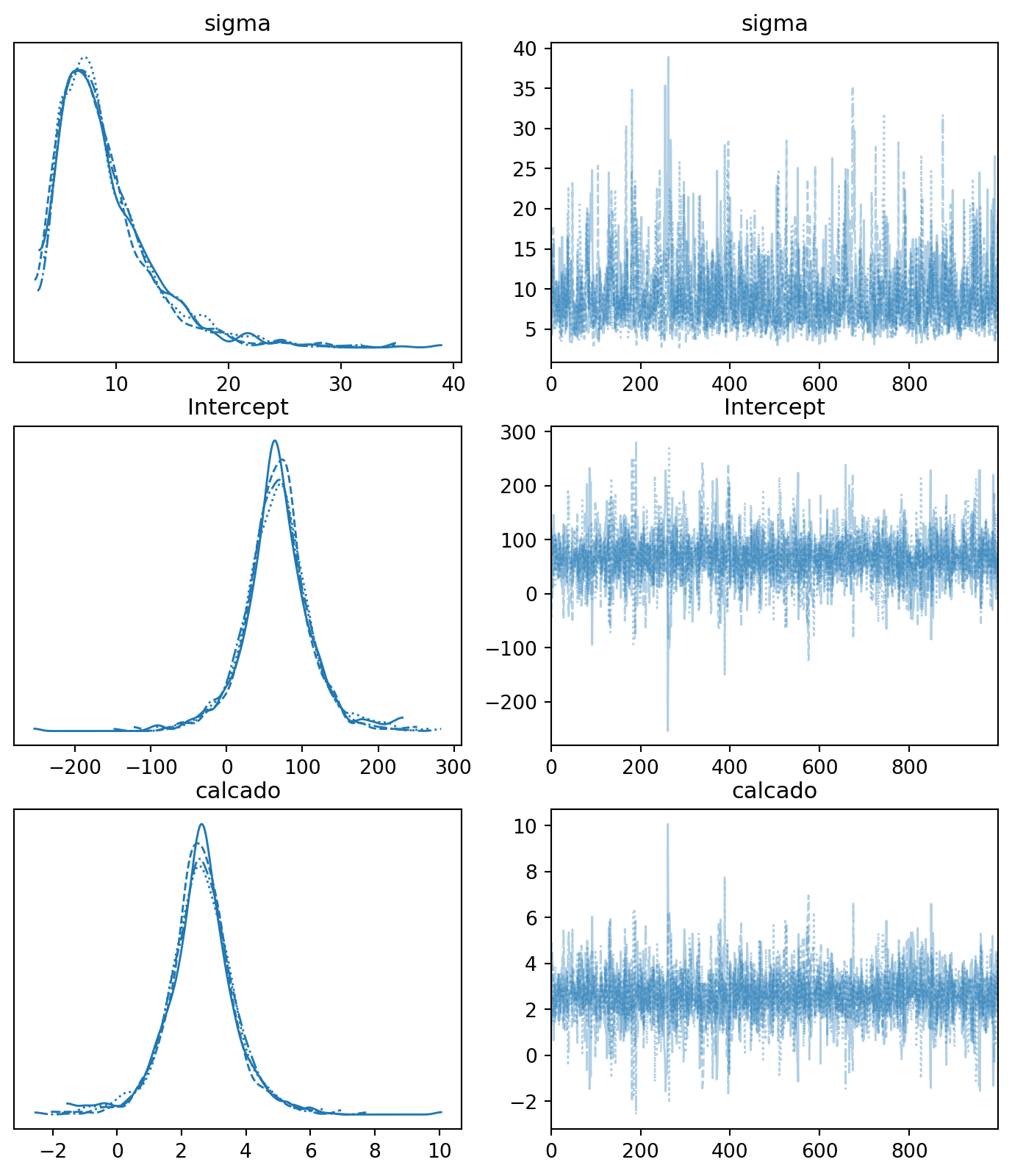 - calcado ~ Normal(…): Define a prior para o coeficiente de regressão associado à variável calcado (\(\beta_1\)).