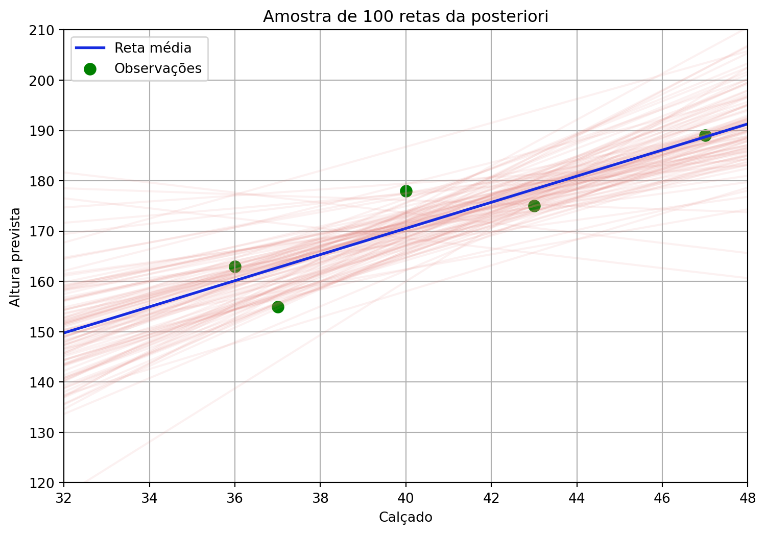 O Intervalo de Credibilidade representa nossa incerteza sobre o valor médio esperado da altura para indivíduos com um determinado número de calçado, refletindo exclusivamente a incerteza epistêmica associada aos parâmetros do modelo. Note que a maioria das retas passa próxima ao centro da distribuição de \(x\) e \(y\), pois, nas proximidades da média de \(x\), há maior confiança na estimativa da trajetória da reta. À medida que nos afastamos desse centro, a incerteza aumenta, resultando em maior variabilidade nas regiões mais afastadas de \(x\).