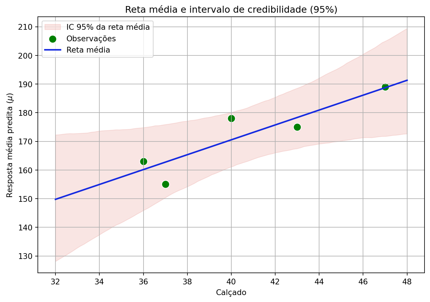 Intervalo de Credibilidade (IC) para μ: Representa nossa incerteza sobre o valor médio esperado da altura para indivíduos com um determinado número de calçado. Este intervalo reflete apenas a incerteza epistêmica sobre os parâmetros do modelo. É mais estreito porque representa nossa incerteza sobre a linha média da relação.