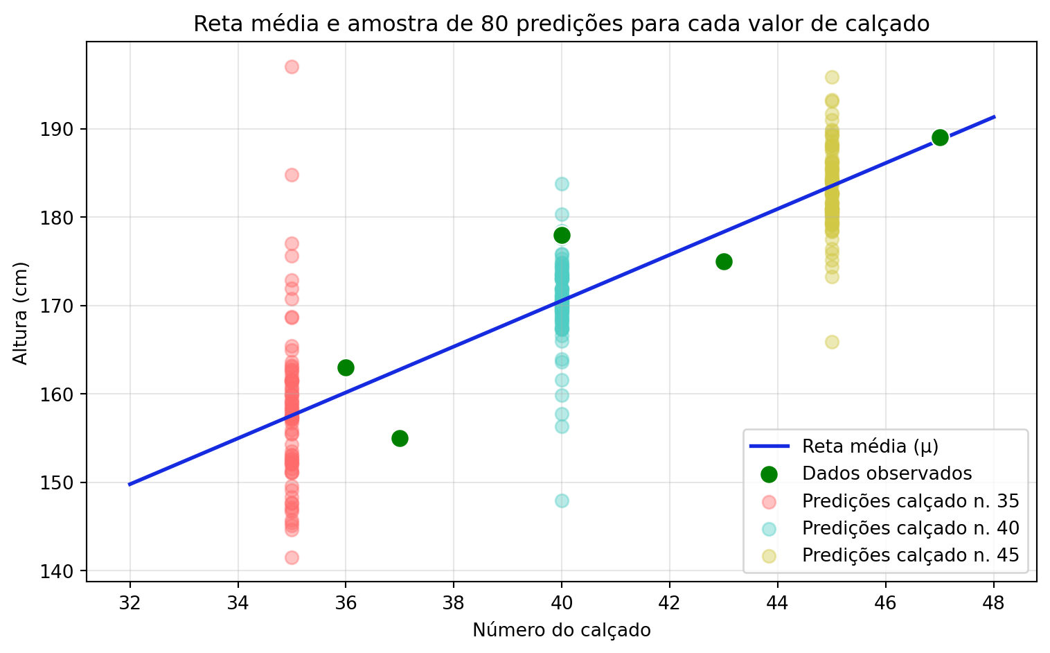 Intervalo de Predição (IP) para novas observações: Representa nossa incerteza sobre a altura de um novo indivíduo específico com um determinado número de calçado. Este intervalo é sempre mais amplo pois incorpora tanto a incerteza epistêmica (sobre os parâmetros) quanto a incerteza aleatória (variabilidade natural representada por \(\sigma\)).