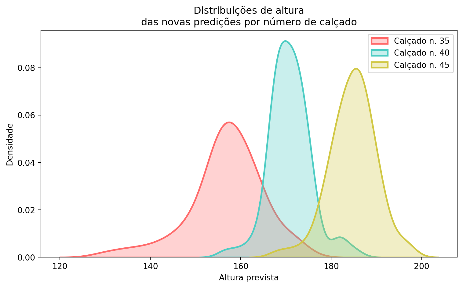 plt.title("Distribuições de altura\ndas novas predições por número de calçado")