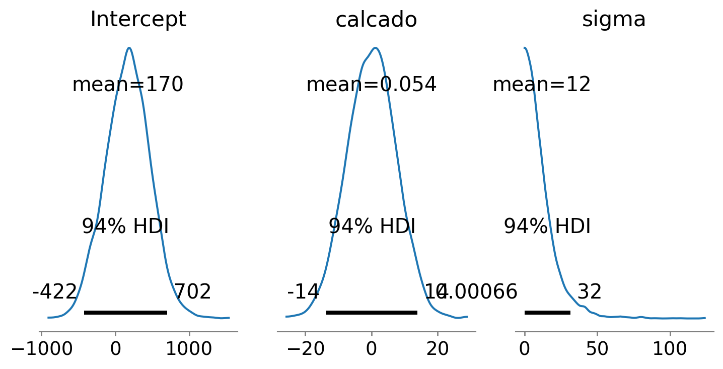mod.plot_priors(var_names=['Intercept', 'calcado', 'sigma'], figsize=(9, 4))array([<Axes: title={'center': 'Intercept'}>,