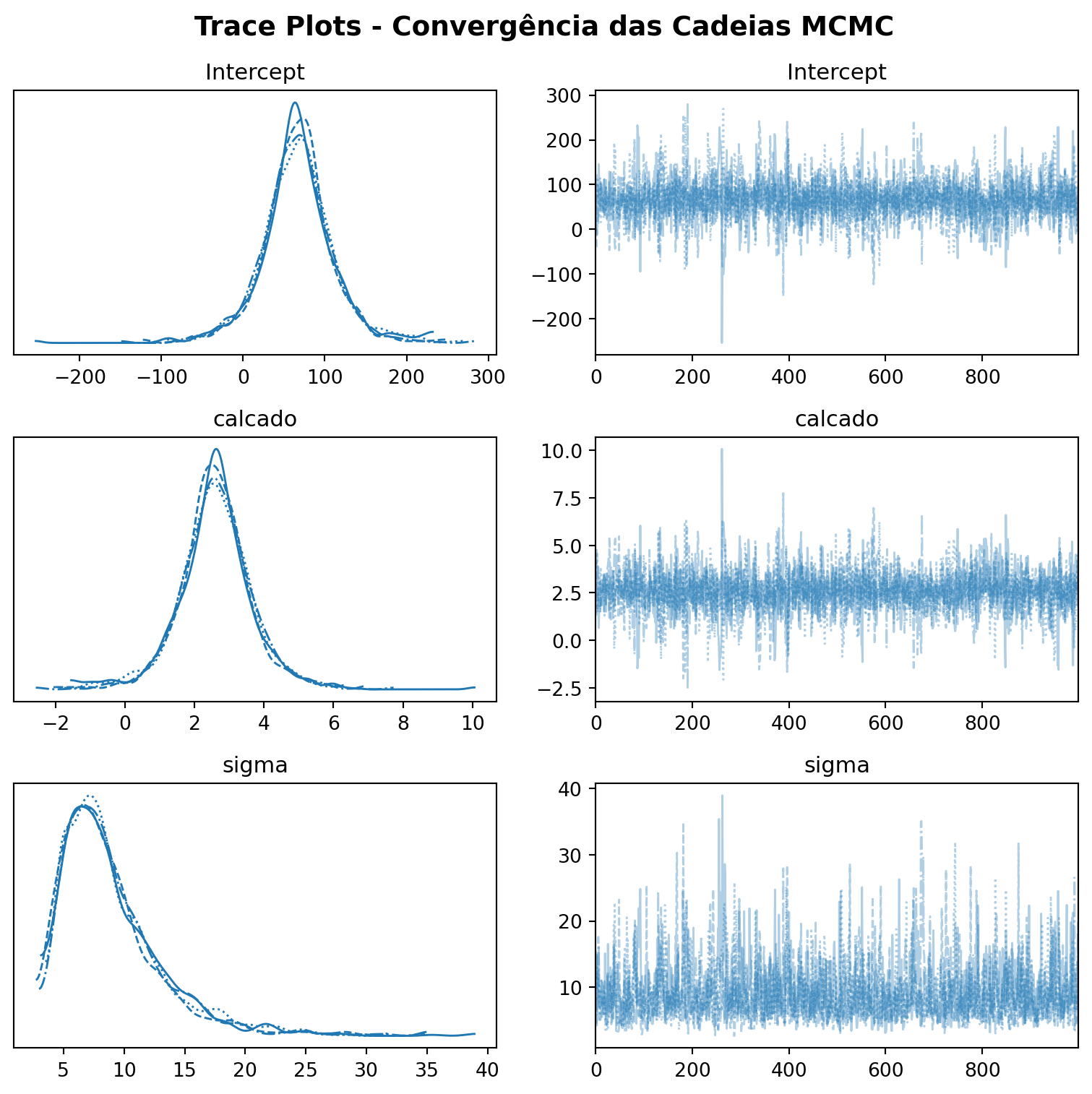 Uma das ferramentas mais comuns para essa avaliação são os trace plots — gráficos que mostram os valores amostrados para cada parâmetro ao longo das iterações. Idealmente, essas cadeias devem parecer bem misturadas e sem padrões visíveis, o que indica que a amostragem atingiu o chamado estado estacionário, sugerindo que as estimativas são confiáveis.
