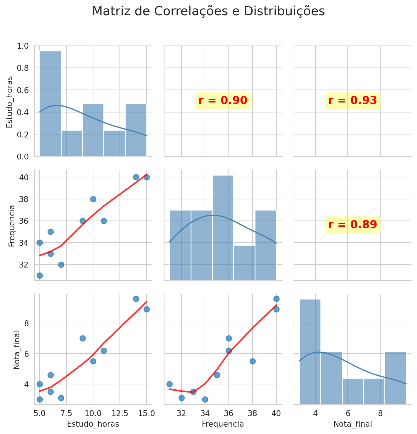 def scatter_com_lowess(x, y, color=None, label=None, frac=0.6, **kws):"""Gráfico de dispersão com curva LOWESS suavizada""" ax = plt.gca()# Scatter plot ax.scatter(x, y, alpha=0.7, color=color, s=50)# Curva LOWESS smoothed = lowess(y, x, frac=frac) ax.plot(smoothed[:, 0], smoothed[:, 1], color="red", linewidth=2, alpha=0.8)def mostrar_correlacao(x, y, **kws):"""Calcula e exibe o coeficiente de correlação de Pearson""" r, _ = pearsonr(x, y) ax = plt.gca() ax.annotate(f"r = {r:.2f}", xy=(.5, .5), xycoords=ax.transAxes, ha='center', va='center', fontsize=14, color='red', fontweight='bold', bbox=dict(boxstyle="round,pad=0.3", facecolor="yellow", alpha=0.3))