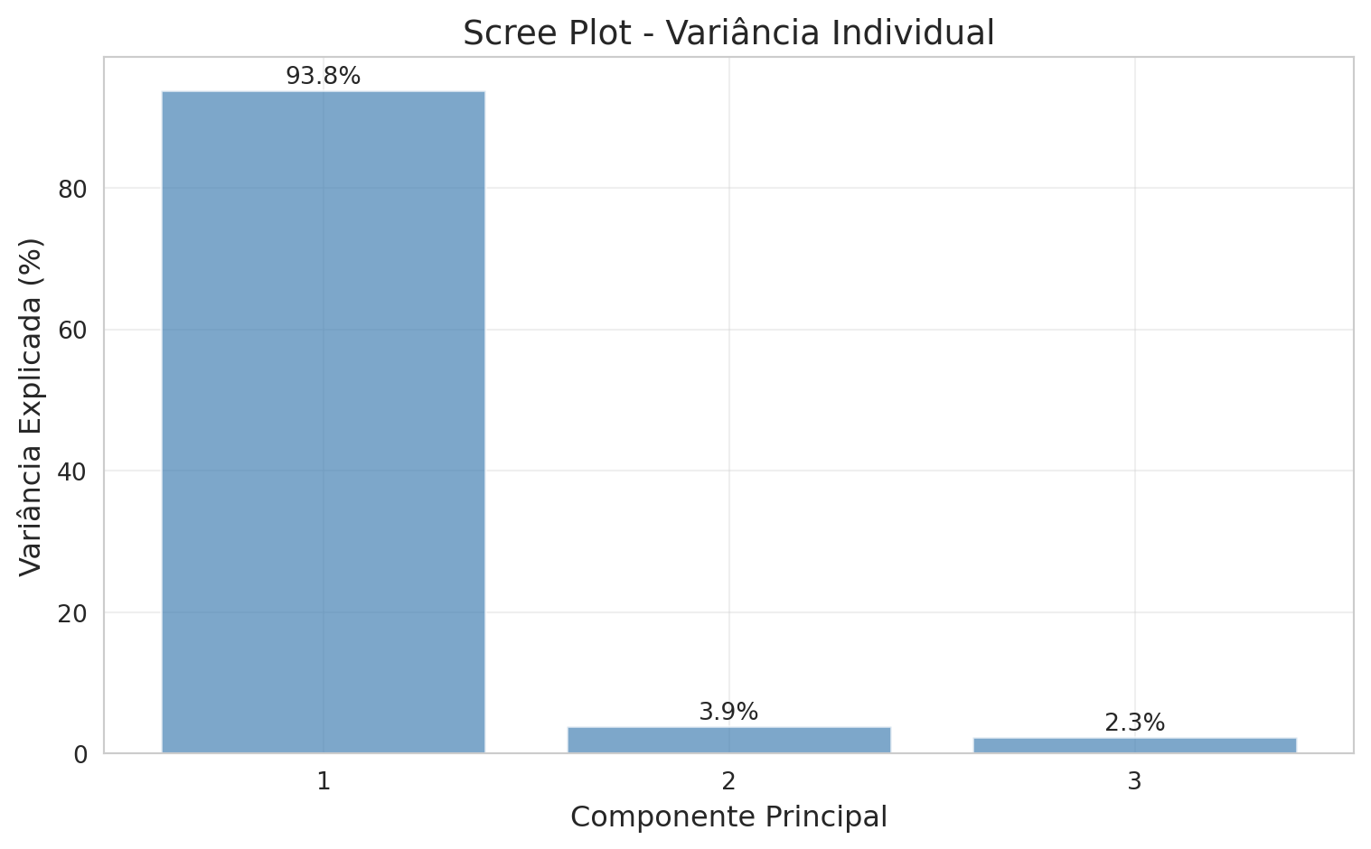 plt.figure(figsize=(8, 5))plt.bar(range(1, len(var_explicada_ratio) +1), var_explicada_ratio *100, alpha=0.7, color='steelblue')plt.xticks(range(1, len(var_explicada_ratio) +1))plt.xlabel('Componente Principal', fontsize=12)plt.ylabel('Variância Explicada (%)', fontsize=12)plt.title('Scree Plot - Variância Individual', fontsize=14)plt.grid(True, alpha=0.3)# Adicionar valores no topo das barrasfor i, v inenumerate(var_explicada_ratio): plt.text(i +1, v *100+1, f'{v*100:.1f}%', ha='center', fontsize=10)plt.tight_layout()plt.show()