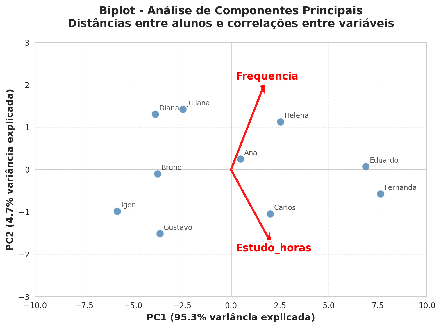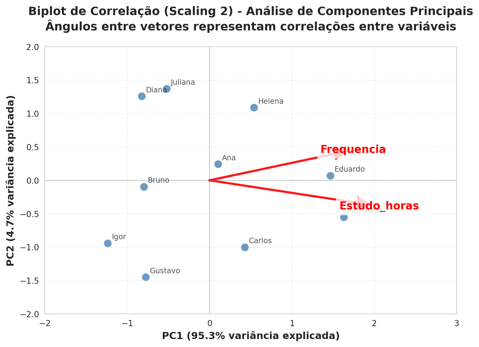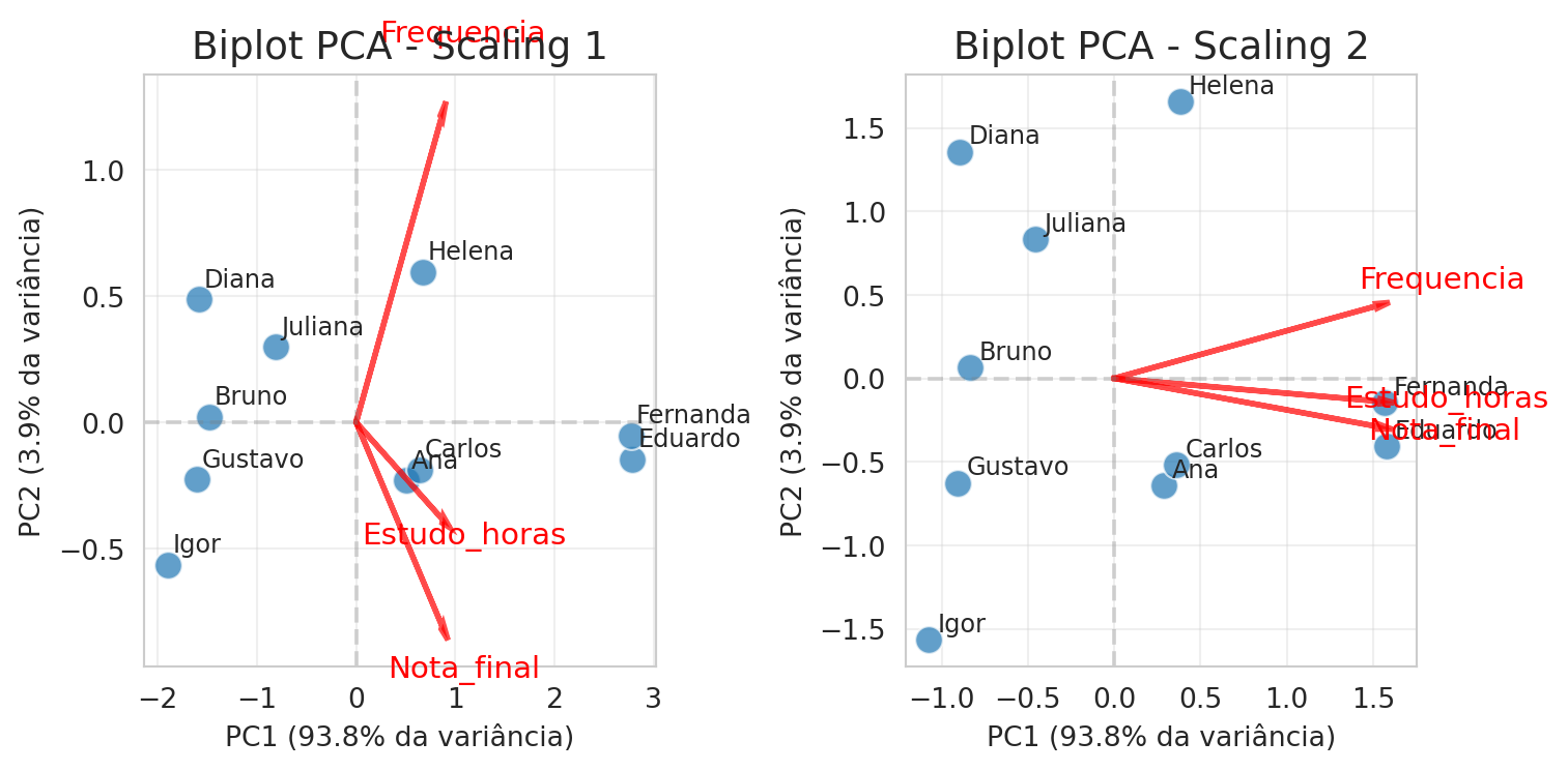 No biplot de distância (Scaling 1), nota-se a proximidade entre os alunos com melhor desempenho, como Fernanda e Eduardo, que obtiveram os maiores valores em ambas as variáveis. Assim, a ordenação dos alunos a partir das variáveis originais pode ser bem representada por um único componente, o PC1. Nesse exemplo, o PC1 reflete a associação conjunta entre Frequência e Estudo_horas, podendo ser interpretado como um indicador de nível de engajamento do estudante na disciplina.