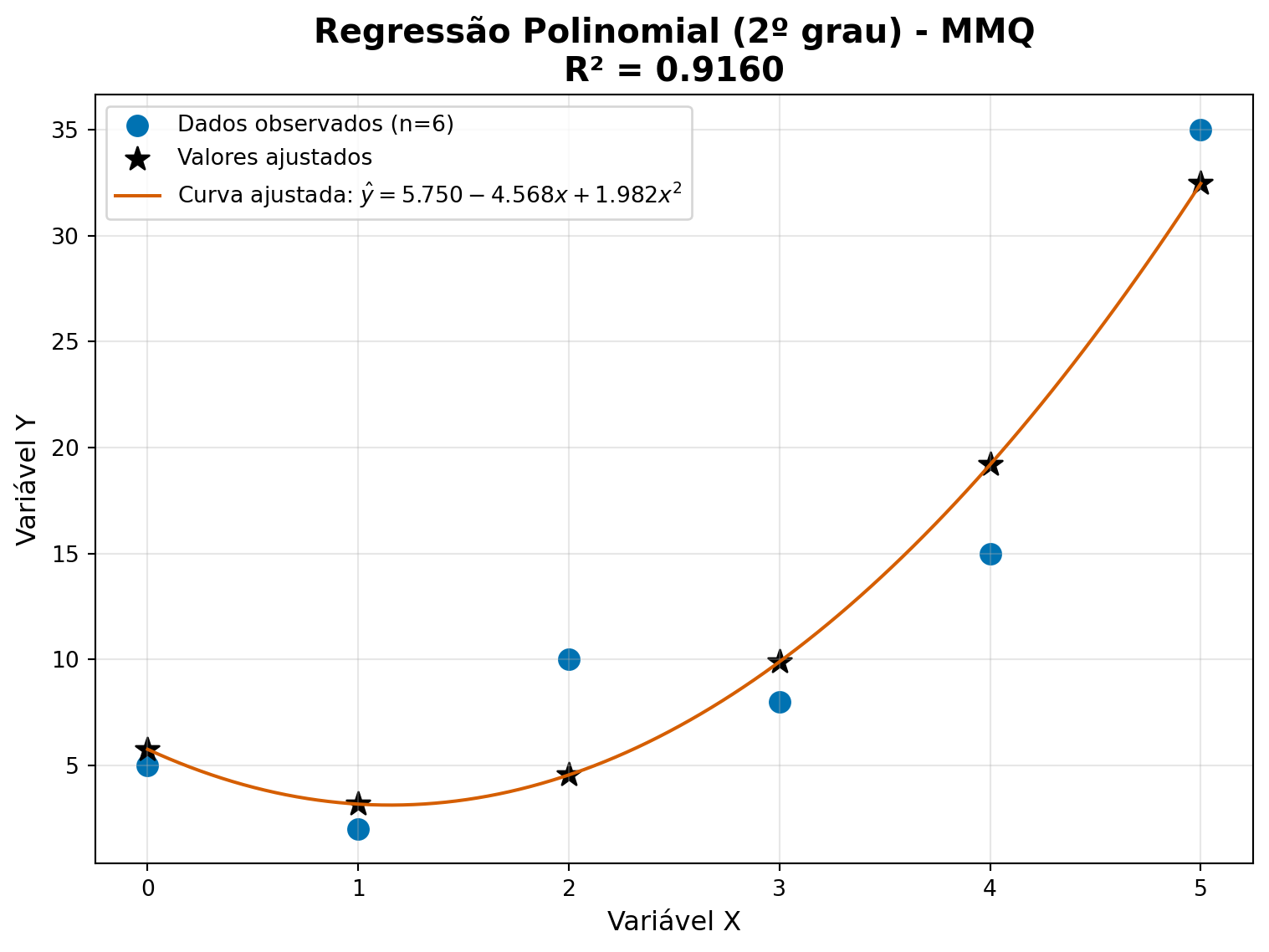 Neste tutorial, vamos implementar o Método dos Mínimos Quadrados (MMQ) em Python para ajustar um modelo de regressão polinomial de segundo grau.