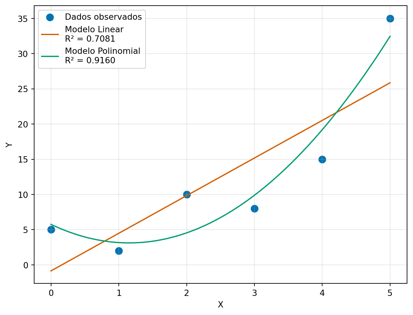 Vamos comparar o ajuste linear e polinomial para os mesmos dados: