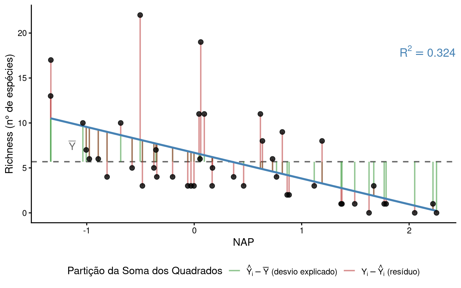 O modelo de regressão linear \(Richness \sim NAP\) explica 32.5% da variação total na riqueza de espécies (\(R^2 = 0.3245\)). Em termos das somas dos quadrados: