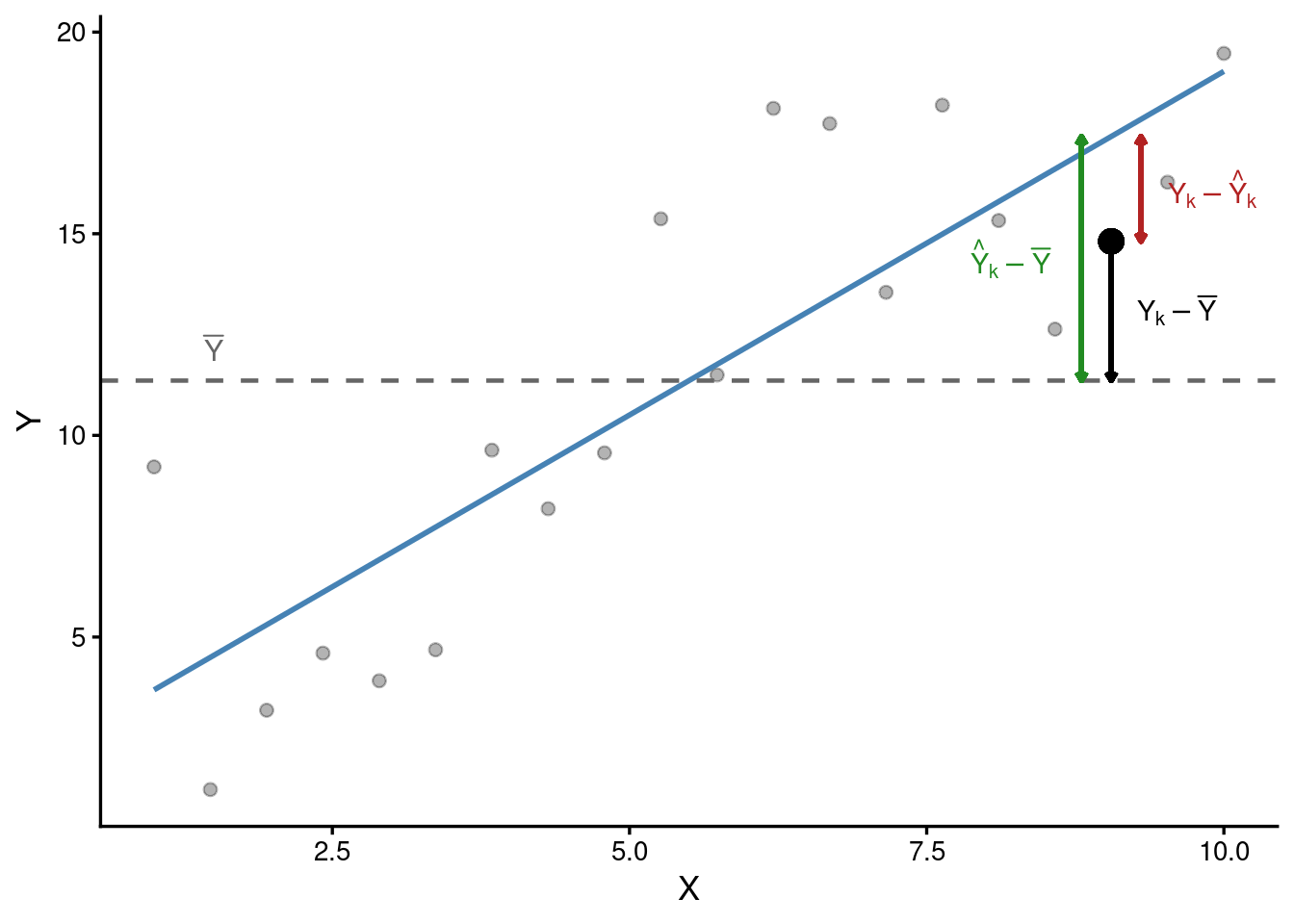 A figura abaixo ilustra os três desvios para uma observação qualquer \((X_k, Y_k)\).